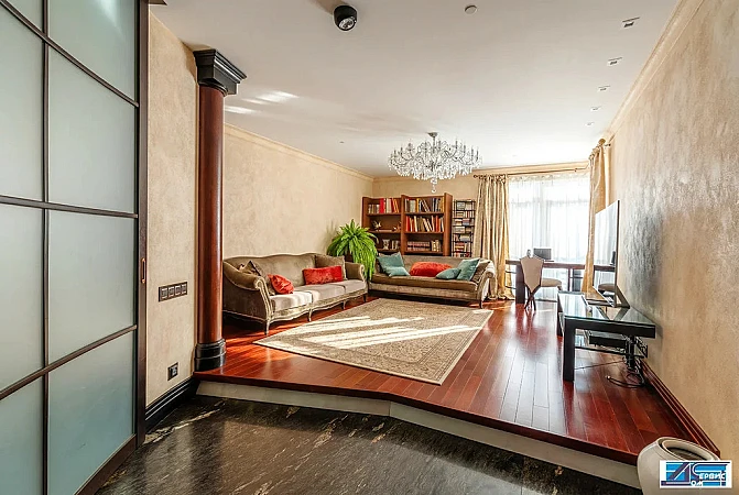 Отделка Квартиры выполнена с использованием дорогостоящих материалов: на полу паркет мербау, мрамор. Декоративное панно выполнено из итальянской мозаики. Кухня Италия — фасады и столешница Олива.