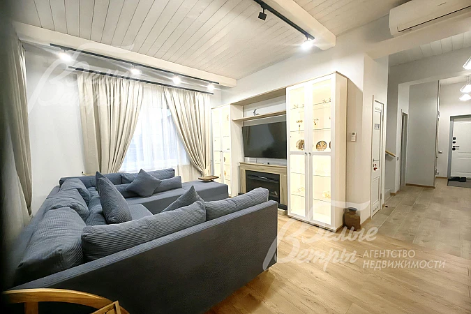 Внутренняя отделка: стильная отделка в современные пастельных тонах: стены 2-го этажа - бревно и обои, высокие потолки, много света, ярких элементов интерьера. Окна второго этажа в доме панорамные и мансардные. В санузлах - плитка до потолка и бревно. Двери филенчатые белого цвета. Качественная стильная сантехника, большие душевые кабины с трапами..