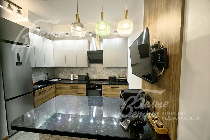 Мебель, оборудование: Мебель подобрана в единой стилистике: мягкая мебель в гостиной (диван и кресла), столовый гарнитур на 8 персон (стол и мягкие стулья). В спальнях - большие и высокие двуспальные кровати с мягким изголовьем, гардеробные шкафы, туалетные столики. Кухонный гарнитур с островом и холодильником Hisense большого объема. Встраиваемая техника: духовой шкаф, индукционная варочная плита, вытяжка и посудомоечная машина от производителя Hansa. Стиральная машина - beko. Во всех помещениях шторы, тюль, люстры и другие осветительные приборы..