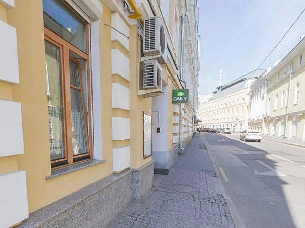 Массивный, четырёхэтажный жёлтый дом украшен белым рустом по первому этажу, несколько окон по фасаду, выходящему на Пречистенку, имеет портики с полуколонками. Собственник юр. лицо. Используется по собственным нуждам, частично сдаётся в аренду нумизматическому магазину, под офисы. Часть помещения оборудована под банк и обменный пункт. Вентиляция, кондиционирование, ХВС, ГВС, газ, отопление. Собственная парковка во дворе, три входные группы, высота потолков первого этажа 3. 8 м, подвал 3 м. Разрешенная мощность 60 кВт, единовременная 40 кВт. Торг уместен. Может расцениваться как продажа готового бизнеса.