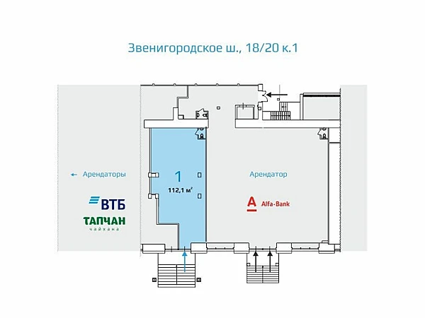 Аренда Street Retail помещения торгового или свободного назначения (ПСН) площадью 112,1 кв. м на 1 этаже БЦ.