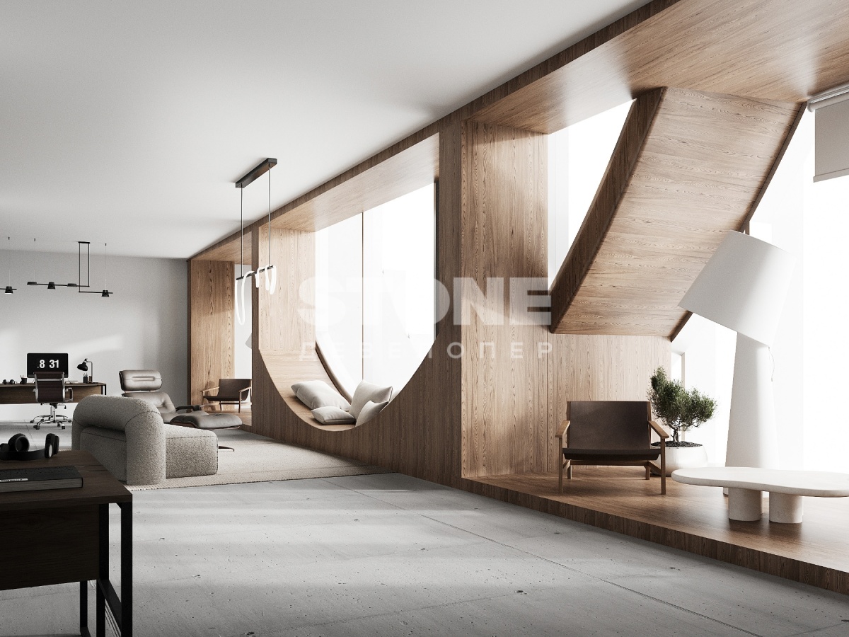 В реализации - офис, рассчитанный на команду от 150 до 180 человек, в составе премиального бизнес-центра STONE Мнёвники. Первый офисный проект в живописной Мнёвниковской пойме среди знаковых объектов спортивной инфраструктуры в окружении ЖК «Остров».
