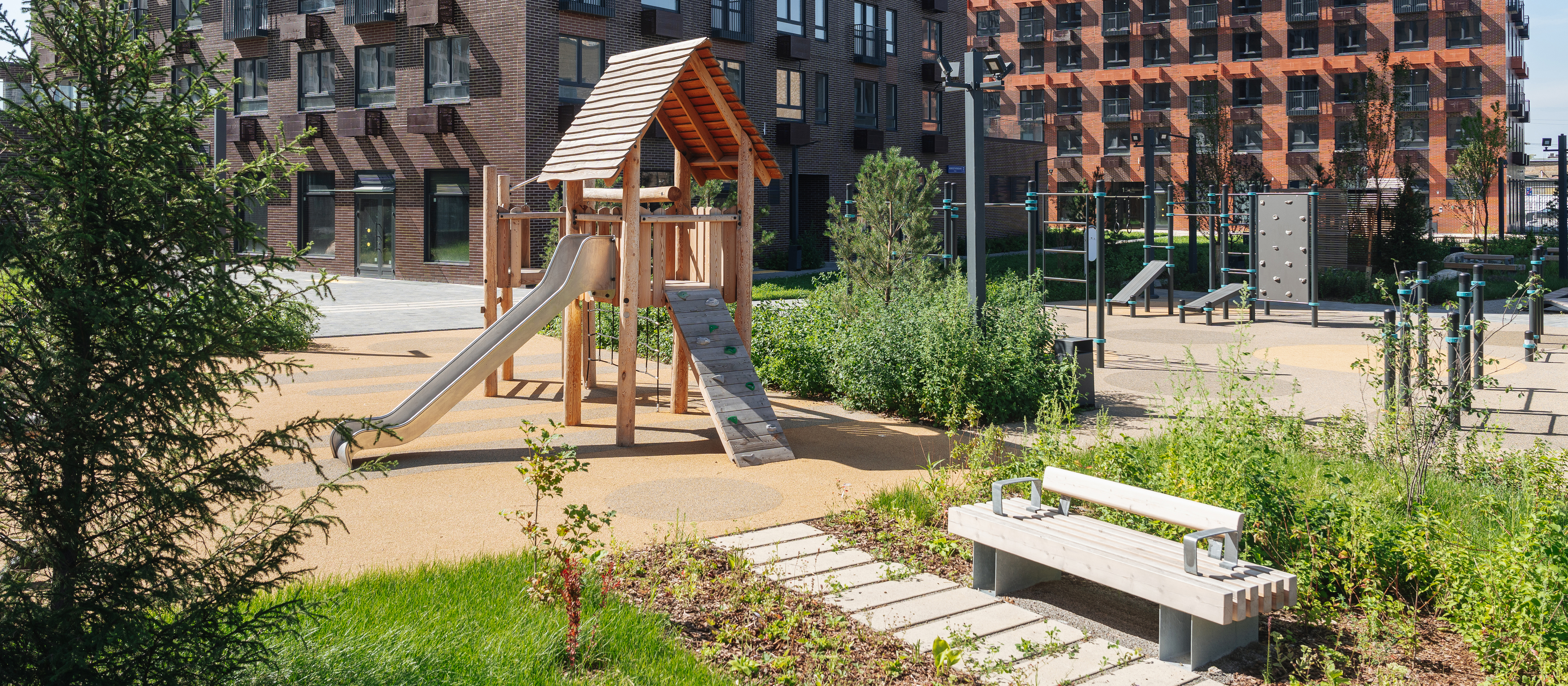 Проект задуман небольшим и уютным — в нём будет всего 4 корпуса с переменной высотой: 28, 33 и 38 этажей с подземным паркингом. Не территории мы построим детский сад на 150 малышей и школу для 350 учеников. А во дворе — зелёный парк с детскими и спортивными площадками и зонами для отдыха. На первых этажах откроются магазины, кафе и другие сервисы.