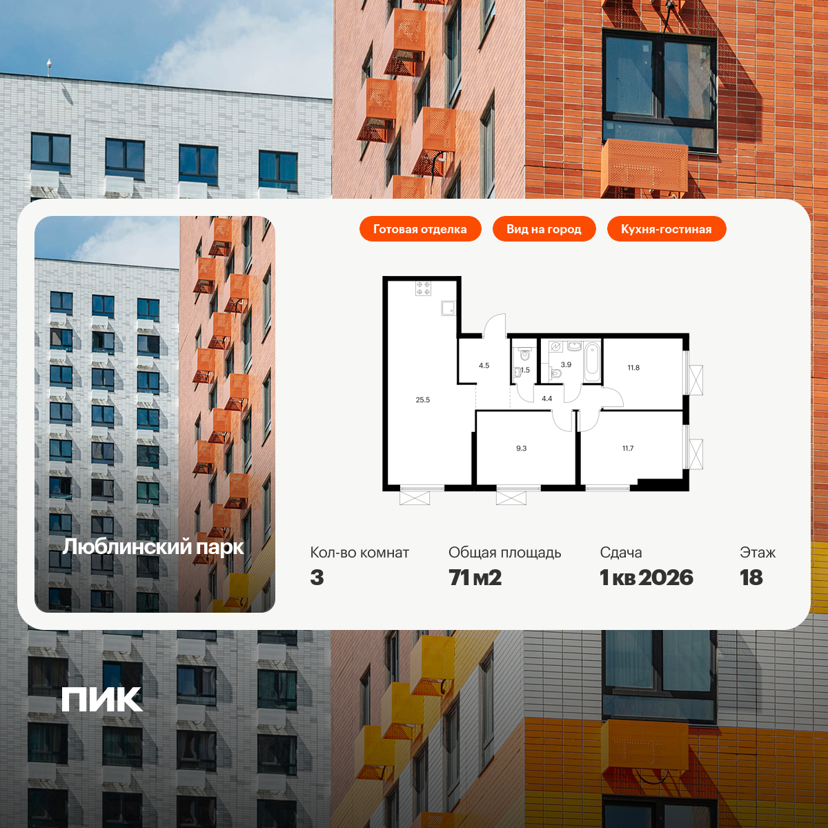 Продаётся 3-комн.квартира площадью 71.00 кв.м на 18 этаже 33 этажного дома (Корпус 14.1, секция 1) проекта ПИК Люблинский парк. Светлый просторный подъезд на уровне земли, функциональная планировка, большие окна, с отделкой.