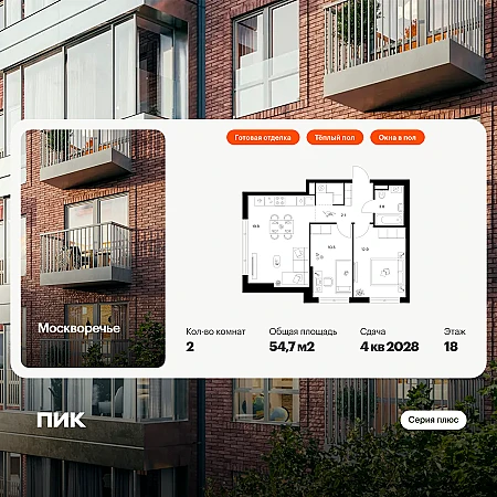 Продаётся 2-комн.квартира площадью 54.70 кв.м на 18 этаже 29 этажного дома (Корпус 2.1, секция 1) проекта ПИК Москворечье. Светлый просторный подъезд на уровне земли, функциональная планировка, большие окна, с отделкой.
