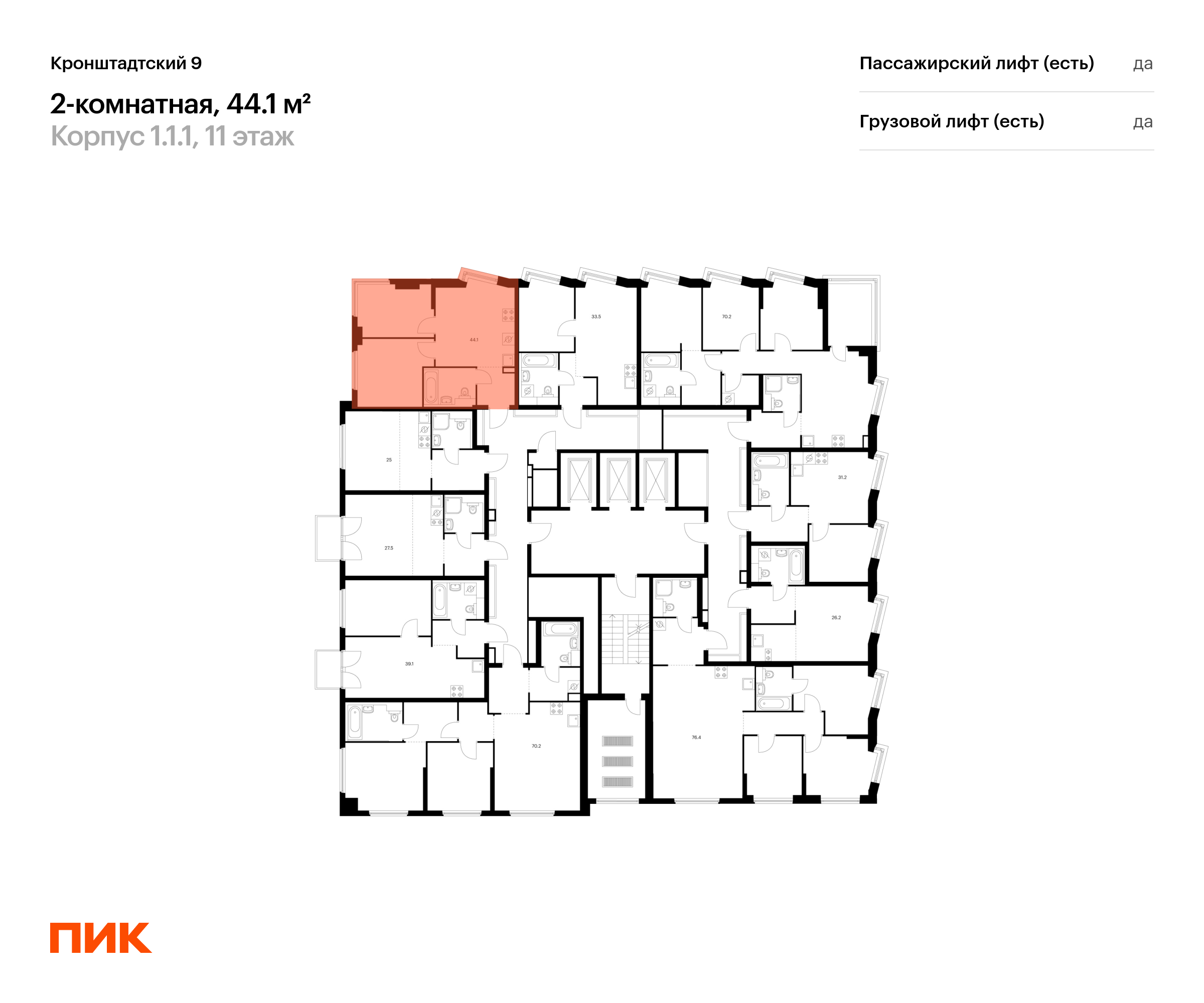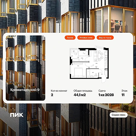 Продаётся 2-комн.квартира площадью 44.10 кв.м на 11 этаже 12 этажного дома (Корпус 1.1.1, секция 1) проекта ПИК Кронштадтский 9. Светлый просторный подъезд на уровне земли, функциональная планировка, большие окна, с отделкой.