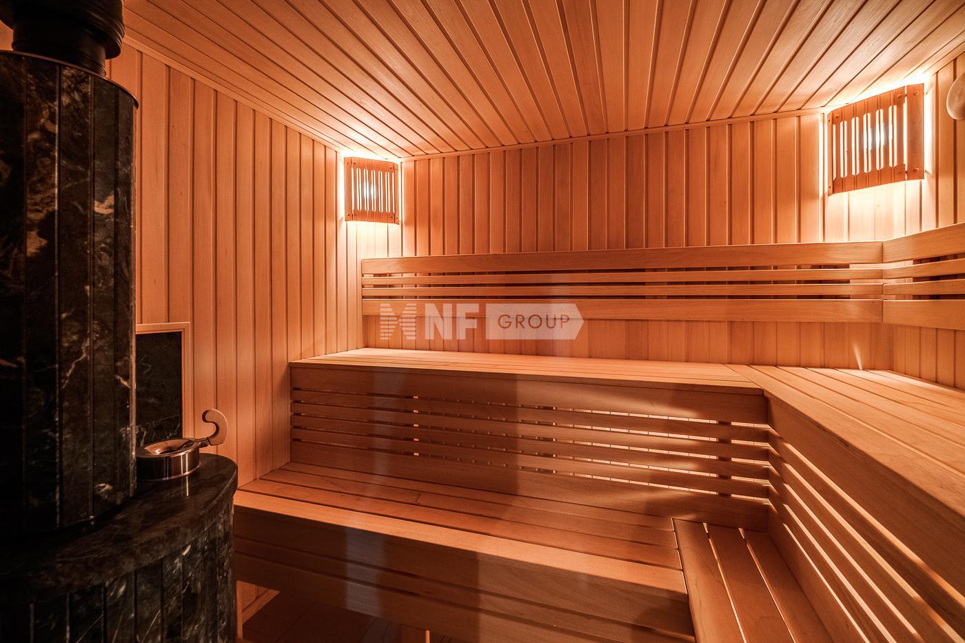 1 этаж: прихожая с гардеробной комнатой, гостиная, кухня, столовая с выходом на террасу, бассейн длиной 17 м, сауна и хаммам с комнатой отдыха с выходом на террасу, с/у, гараж на 2 а/м;