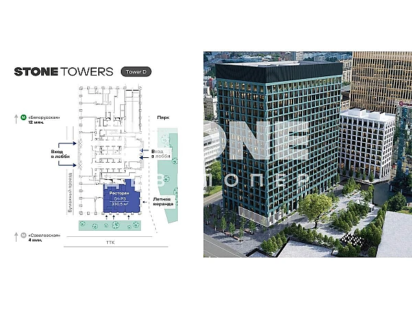 В реализации - помещение под ресторан с возможностью организации летней веранды в составе бизнес-центра класса А STONE Towers (башня D) напрямую от девелопера STONE, лидера офисного рынка.