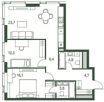 Продается 2-комнатная квартира от застройщика: общая площадь 66.20 м, жилая м, кухня м, 25-й этаж, жилой квартал «Вдохновение», корпус 34 (секция 1) . Срок сдачи: 4 квартал 2027 года.