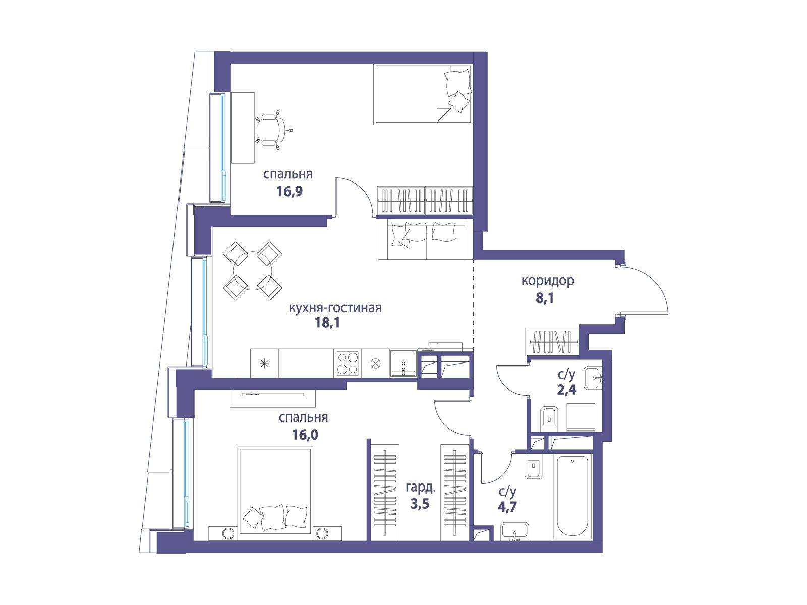 Продается 2-комнатная квартира от застройщика: общая площадь 69.60 м, жилая 32.90 м, кухня 18.10 м, 25-й этаж, жилой квартал «Вдохновение», корпус 35 (секция 1) . Срок сдачи: 4 квартал 2027 года.