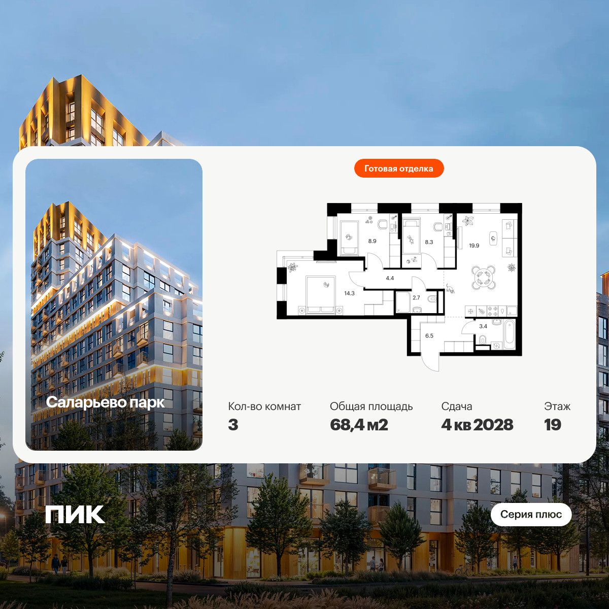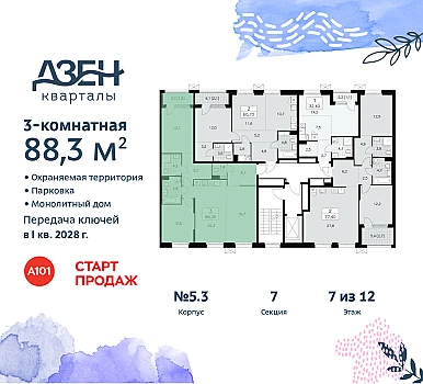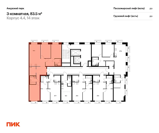 Продаётся 3-комн.квартира площадью 83.50 кв.м на 14 этаже 19 этажного дома (Корпус 4.4, секция 5) проекта ПИК Амурский парк. Светлый просторный подъезд на уровне земли, функциональная планировка, большие окна, с отделкой.