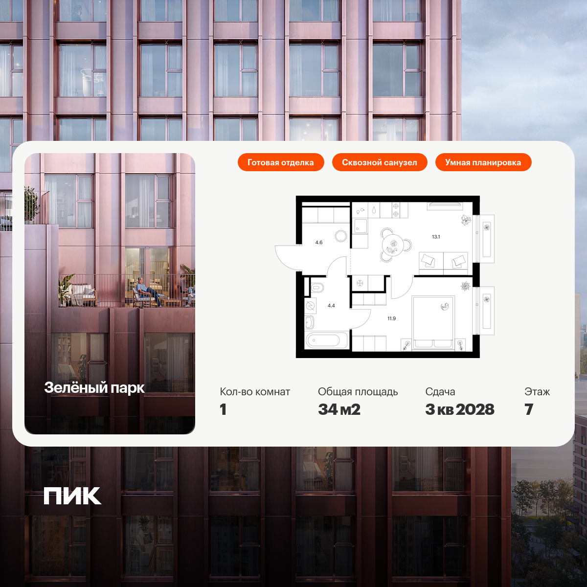 Продаётся 1-комн.квартира площадью 34.00 кв.м на 7 этаже 13 этажного дома (Корпус 5.3, секция 3) проекта ПИК Зелёный парк. Светлый просторный подъезд на уровне земли, функциональная планировка, большие окна, с отделкой.