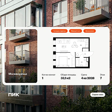 Продаётся 1-комн.квартира площадью 33.10 кв.м на 7 этаже 12 этажного дома (Корпус 2.3, секция 4) проекта ПИК Москворечье. Светлый просторный подъезд на уровне земли, функциональная планировка, большие окна, с отделкой.