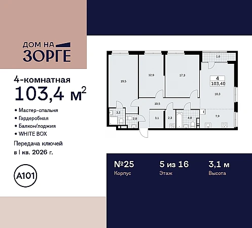 Просторная четырехкомнатная квартира с европланировкой и предчистовой отделкой в ЖК "Дом на Зорге" на 5 этаже. Общая площадь: 103.4 кв.м., жилая: 68 кв.м., суммарная площадь гостиной-столовой с кухонной зоной: 26.2 кв.м. Европланировка, за счет большой площади кухни-гостиной квартира выглядит просторной и очень удобна для жизни. Угловая квартира, окна oбecпeчивaют paвнoмepнoe ocвeщeниe в тeчeниe дня. В квартире одна лоджия, два совмещенных и один раздельный санузел. Высота потолков 3.1 м.