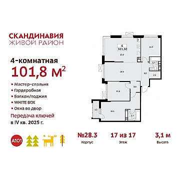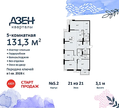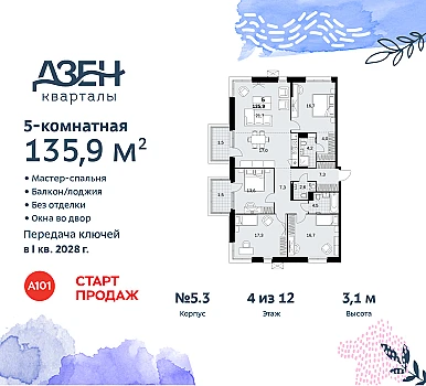 5-комн. квартира бизнес-класса с европланировкой от застройщика в ЖК "Скандинавия" на 15 этаже. Квартира без отделки, новый собственник может сделать ремонт по индивидуальному дизайн-проекту. Общая площадь: 122 кв.м., жилая: 69.9 кв.м., общая площадь гостиной-столовой с кухонной зоной: 26 кв.м. Европейская планировка, кухня-гостиная - идеальный вариант для тех, кто любит часто принимать гостей. Квартира угловая, идеально подойдет любителям тишины и панорамных видов. В квартире одна лоджия, три совмещенных и один раздельный санузел. Высота потолков 3.1 м.