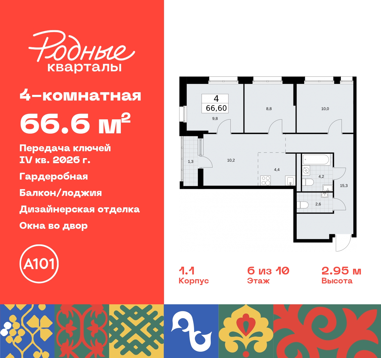 Купить 4к квартиру 66 м² в ЖК "Родные кварталы"
