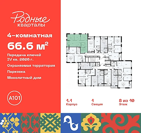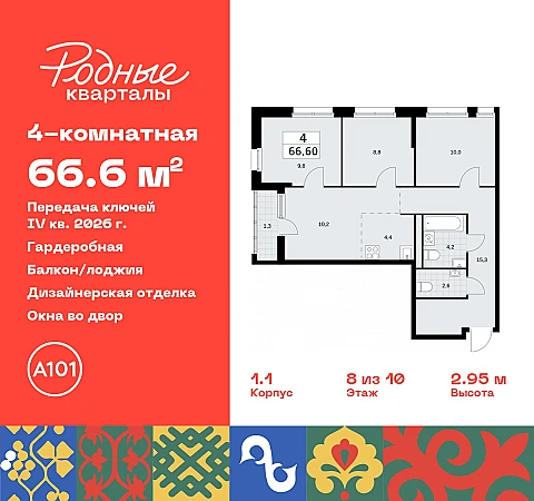 Купить 4к квартиру 66 м² в ЖК "Родные кварталы"