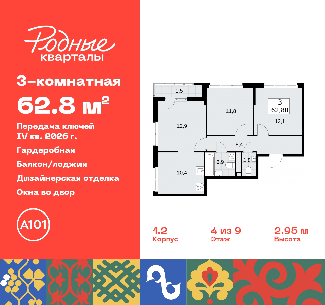 Продается 3-комн. квартира от застройщика с отделкой в ЖК "Родные кварталы" на 4 этаже. Общая площадь: 62.8 кв.м., жилая: 36.8 кв.м., площадь просторной кухни-столовой: 10.4 кв.м. Квартира угловая, идеально подойдет любителям тишины и панорамных видов. В квартире одна лоджия, один совмещенный и один раздельный санузел. Высота потолков 2.9 м.