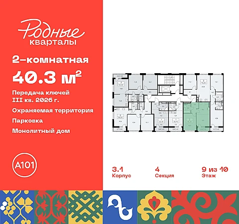 Дом монолитный, черырехподъездный, высотой 10 этажей. Квартира находится в 4-й секции в корпусе 3.1. На этаже 6 квартир. В подъезде 1 грузовой лифт. Начало строительства - 2 квартал 2024 года. Окончание строительства - 3 квартал 2026 года. Оформление сделки по договору долевого участия.