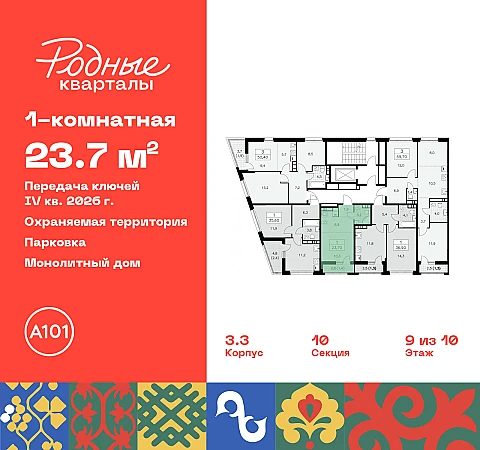 Дом монолитный, черырехподъездный, переменной этажности, от 9 до 10 этажей. Квартира находится в 4-й секции высотой 9 этажей в корпусе 3.3. На этаже 5 квартир. В подъезде 1 грузовой лифт. Начало строительства - 2 квартал 2024 года. Окончание строительства - 4 квартал 2026 года. Оформление сделки по договору долевого участия.