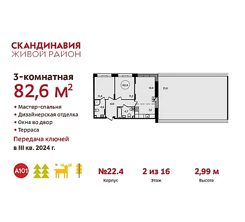 Просторная 3-комн. квартира бизнес-класса с отделкой в ЖК "Скандинавия" на 2 этаже. Общая площадь: 84.4 кв.м. Наличие в квартире террасы открывает возможность для обустройства дополнительной площади. Высота потолков 2.99 м.