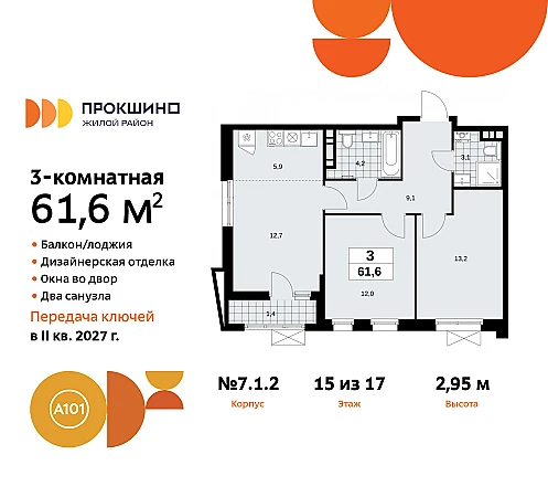 3-комн. квартира с европланировкой и отделкой в ЖК "Прокшино" на 15 этаже. Общая площадь: 61.6 кв.м., жилая: 37.9 кв.м., общая площадь гостиной-столовой с кухонной зоной: 18.6 кв.м. Европейская планировка, площадь комнат позволяет разместить в них все необходимое, а в просторной кухне-гостиной удобно как готовить, так и отдыхать. Квартира угловая, идеально подойдет любителям тишины и панорамных видов. В квартире одна лоджия, два совмещенных санузла. Высота потолков 2.95 м.