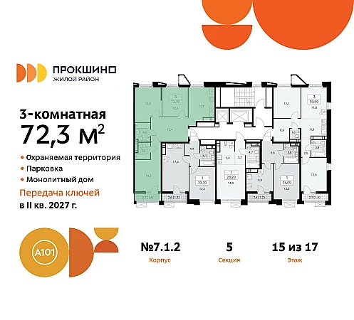 Дом монолитный, трехподъездный, переменной этажности, от 12 до 17 этажей. Квартира находится во 2-й секции высотой 17 этажей в корпусе 7.1.2. На этаже 5 квартир. В подъезде 1 пассажирский и 1 грузовой лифт. Начало строительства - 4 квартал 2024 года. Окончание строительства - 2 квартал 2027 года. Оформление сделки по договору долевого участия.
