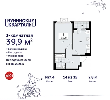 Однокомнатная квартира-студия от застройщика с отделкой в ЖК "Прокшино" на 12 этаже. Общая площадь: 28.3 кв.м., площадь гостиной 20.2 кв.м., из которых 5.5 кв.м. выделено под кухонную зону. Все окна выходят на одну сторону. В квартире один совмещенный санузел. Высота потолков 2.95 м.