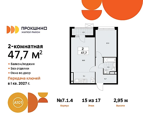 Двухкомнатная квартира с европланировкой в ЖК "Прокшино" на 15 этаже. Квартира без отделки, полностью готова к чистовой отделке и дальнейшему ремонту. Общая площадь: 47.7 кв.м., жилая: 30.3 кв.м., общая площадь гостиной-столовой с кухонной зоной: 23.1 кв.м. Европланировка, кухня-гостиная - идеальный вариант для тех, кто любит часто принимать гостей. Комнаты изолированные, все окна выходят на одну сторону. В квартире одна лоджия, один совмещенный санузел. Высота потолков 2.95 м.
