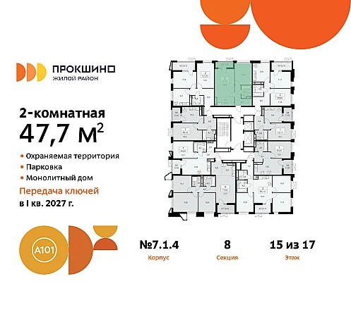 Квартира находится в корпусе 7.1.4. Дом монолитный, одноподъездный, высотой 17 этажей. На этаже 9 квартир. В подъезде 1 пассажирский и 1 грузовой лифт. Начало строительства - 4 квартал 2024 года. Окончание строительства - 1 квартал 2027 года. Оформление сделки по договору долевого участия.