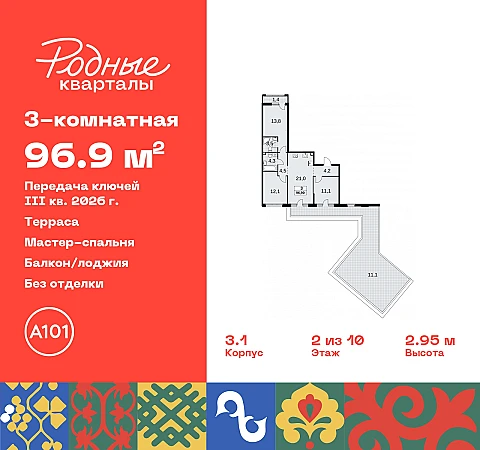 Продается трехкомнатная квартира в ЖК "Родные кварталы" на 2 этаже. Квартира без отделки, новый владелец может сделать ремонт по индивидуальному проекту. Общая площадь: 96.9 кв.м. Наличие в квартире террасы открывает возможность для создания зон отдыха в кругу семьи и друзей. Высота потолков 2.95 м.