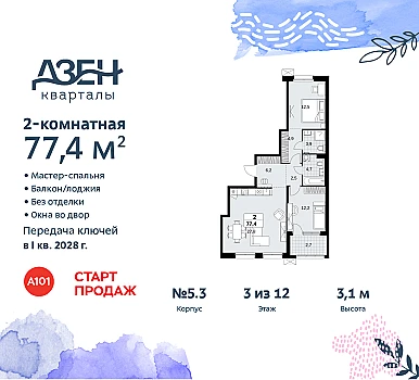 Дом монолитный, черырехподъездный, высотой 10 этажей. Квартира находится в 4-й секции в корпусе 3.1. На этаже 6 квартир. В подъезде 1 грузовой лифт. Начало строительства - 2 квартал 2024 года. Окончание строительства - 3 квартал 2026 года. Оформление сделки по договору долевого участия.