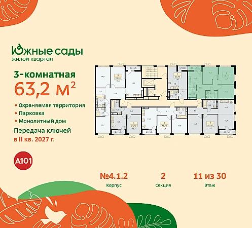 Дом монолитный, черырехподъездный, переменной этажности, от 11 до 30 этажей. Квартира находится в 1-й секции высотой 11 этажей в корпусе 4.1.2. На этаже 6 квартир. В подъезде 1 пассажирский и 1 грузовой лифт. Начало строительства - 2 квартал 2024 года. Окончание строительства - 2 квартал 2027 года. Оформление сделки по договору долевого участия.