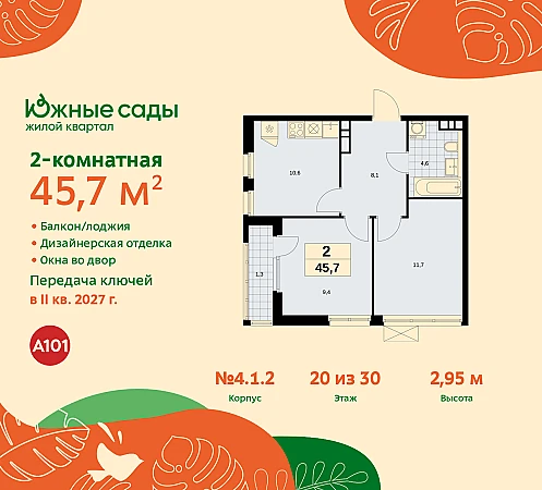 Двухкомнатная квартира с отделкой в ЖК "Южные сады" на 20 этаже. Общая площадь: 45.7 кв.м., жилая: 21.1 кв.м., площадь просторной кухни-столовой: 10.6 кв.м. Квартира угловая, окна oбecпeчивaют paвнoмepнoe ocвeщeниe в тeчeниe дня. В квартире одна лоджия, один совмещенный санузел. Высота потолков 2.95 м.