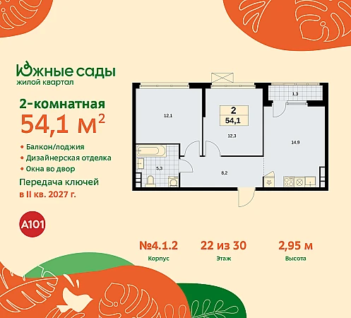 Купить 2к квартиру 54 м² в ЖК "Южные сады"