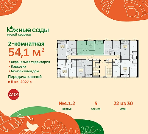 Дом монолитный, черырехподъездный, переменной этажности, от 11 до 30 этажей. Квартира находится в 4-й секции высотой 22 этажа в корпусе 4.1.2. На этаже 6 квартир. В подъезде 1 пассажирский и 1 грузовой лифт. Начало строительства - 2 квартал 2024 года. Окончание строительства - 2 квартал 2027 года. Оформление сделки по договору долевого участия.