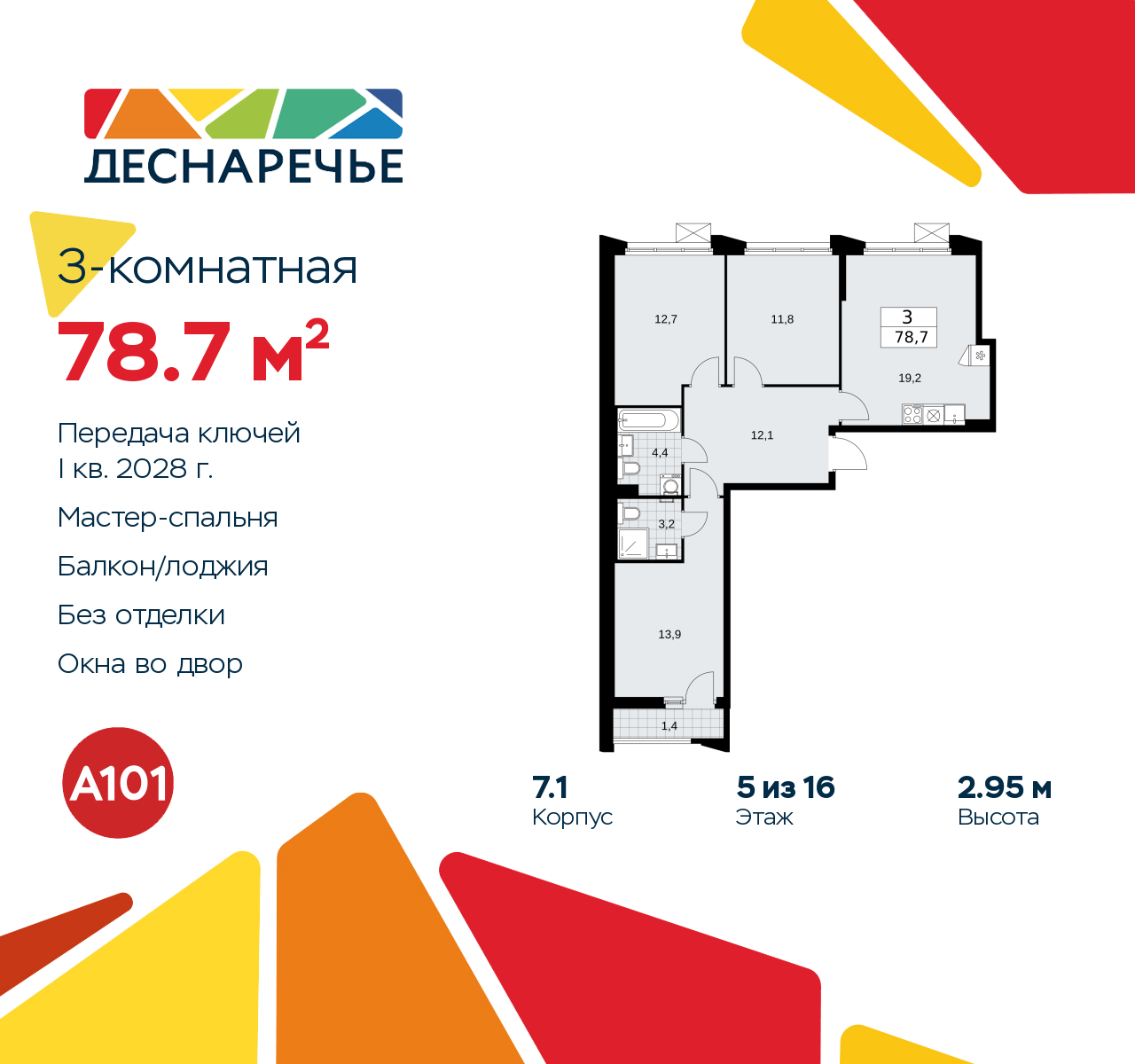 Продается 3-комн. квартира в ЖК "Деснаречье" на 5 этаже. Квартира без отделки, полностью готова к ремонту. Общая площадь: 78.7 кв.м., жилая: 38.4 кв.м., площадь просторной кухни-столовой: 19.2 кв.м. Квартира - распашонка, без проходных комнат, окна выходят на paзные стороны дома. В квартире одна лоджия, два совмещенных санузла. Высота потолков 2.95 м.