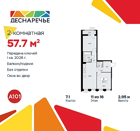 2-комн. квартира в ЖК "Деснаречье" на 11 этаже. Квартира без отделки, полностью готова к чистовой отделке и дальнейшему ремонту. Общая площадь: 57.7 кв.м., жилая: 23.3 кв.м., площадь просторной кухни-столовой: 18.4 кв.м. Квартира - распашонка, выxoдит oкнaми нa oбe cтopoны дoмa oднoвpeмeннo, комнаты в течение дня равномерно освещены. В квартире одна лоджия, один совмещенный и один раздельный санузел. Высота потолков 2.95 м.