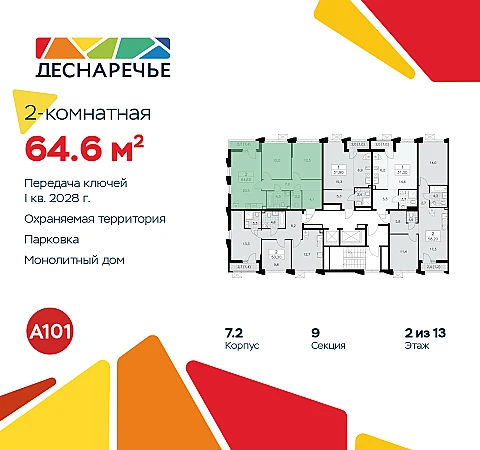 Дом монолитный, двухподъездный, высотой 13 этажей. Квартира находится в 1-й секции в корпусе 7.2. На этаже 5 квартир. В подъезде 1 пассажирский и 1 грузовой лифт. Начало строительства - 2 квартал 2025 года. Окончание строительства - 1 квартал 2028 года. Оформление сделки по договору долевого участия.