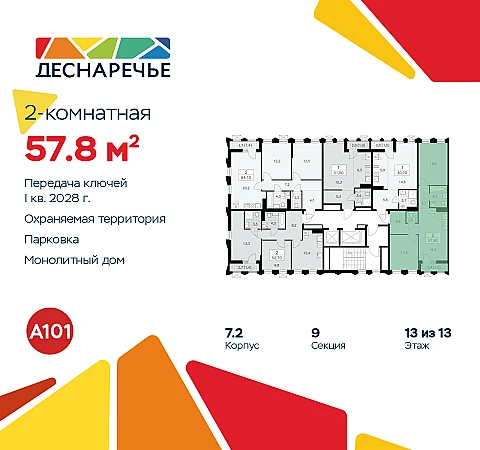 Дом монолитный, двухподъездный, высотой 13 этажей. Квартира находится в 1-й секции в корпусе 7.2. На этаже 5 квартир. В подъезде 1 пассажирский и 1 грузовой лифт. Начало строительства - 2 квартал 2025 года. Окончание строительства - 1 квартал 2028 года. Оформление сделки по договору долевого участия.