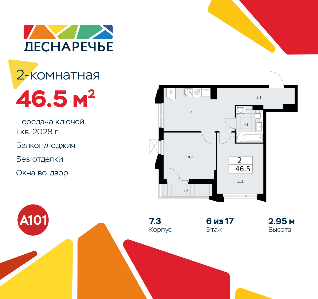 2-комн. квартира от застройщика в ЖК "Деснаречье" на 6 этаже. Квартира без отделки, после оформления собственности можно делать ремонт. Общая площадь: 46.5 кв.м., жилая: 22.2 кв.м., площадь просторной кухни-столовой: 10.2 кв.м. Квартира угловая, идеально подойдет любителям тишины и панорамных видов. В квартире одна лоджия, один совмещенный санузел. Высота потолков 2.95 м.