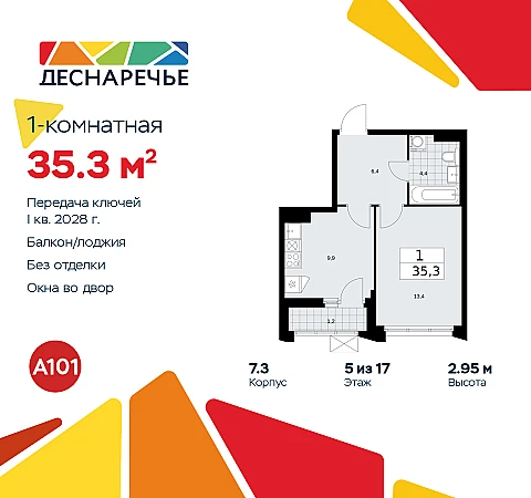 Продается 1-комн. квартира в ЖК "Деснаречье" на 5 этаже. Квартира без отделки, новый владелец может сделать ремонт по индивидуальному проекту. Общая площадь: 35.3 кв.м., жилая: 13.4 кв.м., площадь просторной кухни-столовой: 9.9 кв.м. Все окна выходят на одну сторону. В квартире одна лоджия, один совмещенный санузел. Высота потолков 2.95 м.