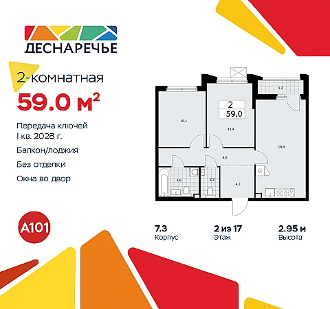 Двухкомнатная квартира от застройщика в ЖК "Деснаречье" на 2 этаже. Квартира без отделки, после оформления собственности можно делать ремонт. Общая площадь: 59 кв.м., жилая: 21.5 кв.м., площадь просторной кухни-столовой: 18.8 кв.м. Комнаты изолированные, все окна выходят на одну сторону. В квартире одна лоджия, один совмещенный и один раздельный санузел. Высота потолков 2.95 м.