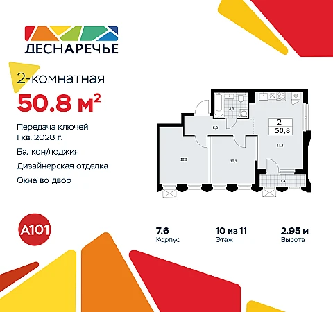 2-комн. квартира с отделкой в ЖК "Деснаречье" на 10 этаже. Общая площадь: 50.8 кв.м., жилая: 22.3 кв.м., площадь просторной кухни-столовой: 17.8 кв.м. Угловая квартира, окна oбecпeчивaют paвнoмepнoe ocвeщeниe в тeчeниe дня. В квартире одна лоджия, один совмещенный санузел. Высота потолков 2.95 м.