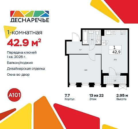 Однокомнатная квартира с отделкой в ЖК "Деснаречье" на 13 этаже. Общая площадь: 42.9 кв.м., жилая: 13.9 кв.м., площадь просторной кухни-столовой: 17.5 кв.м. Все окна выходят на одну сторону. В квартире одна лоджия, один совмещенный санузел. Высота потолков 2.95 м.