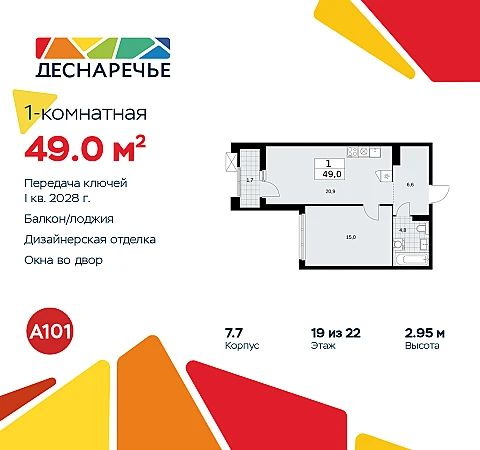 1-комн. квартира от застройщика с отделкой в ЖК "Деснаречье" на 19 этаже. Общая площадь: 49 кв.м., жилая: 15 кв.м., площадь просторной кухни-столовой: 20.9 кв.м. Все окна выходят на одну сторону. В квартире одна лоджия, один совмещенный санузел. Высота потолков 2.95 м.