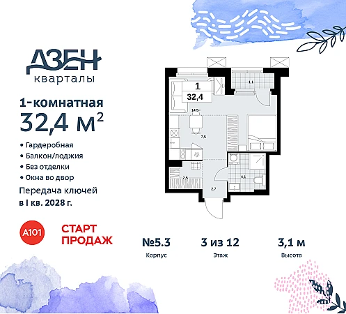 Купить 1к квартиру 32 м² в ЖК "Дзен-кварталы"