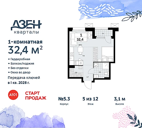 Однокомнатная квартира бизнес-класса-студия в ЖК "Дзен-кварталы" на 5 этаже. Квартира без отделки, после получения ключей можно делать ремонт. Общая площадь: 32.4 кв.м., площадь гостиной 22 кв.м., из которых 7.5 кв.м. выделено под кухонную зону. Все окна выходят на одну сторону. В квартире одна лоджия, один совмещенный санузел. Высота потолков 3.1 м.