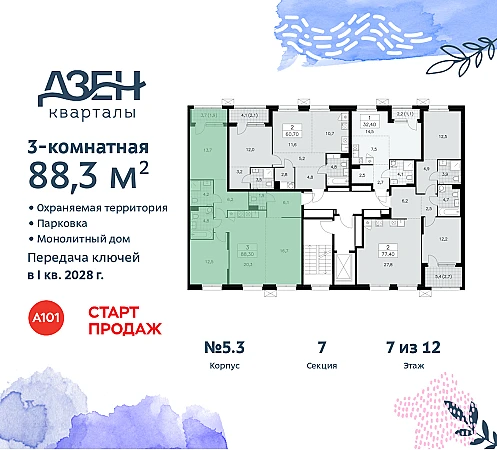 Купить 3к квартиру 88 м² в ЖК "Дзен-кварталы"