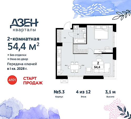 Продается двухкомнатная квартира бизнес-класса с европланировкой в ЖК "Дзен-кварталы" на 4 этаже. Квартира без отделки, новый собственник может сделать ремонт по своему проекту. Общая площадь: 54.4 кв.м., жилая: 31.8 кв.м., суммарная площадь гостиной-столовой с кухонной зоной: 28.1 кв.м. Европланировка, зона гостиной комнаты объединена с кухней. Угловая квартира, идеально подойдет любителям тишины и панорамных видов. В квартире один совмещенный санузел. Высота потолков 3.1 м.